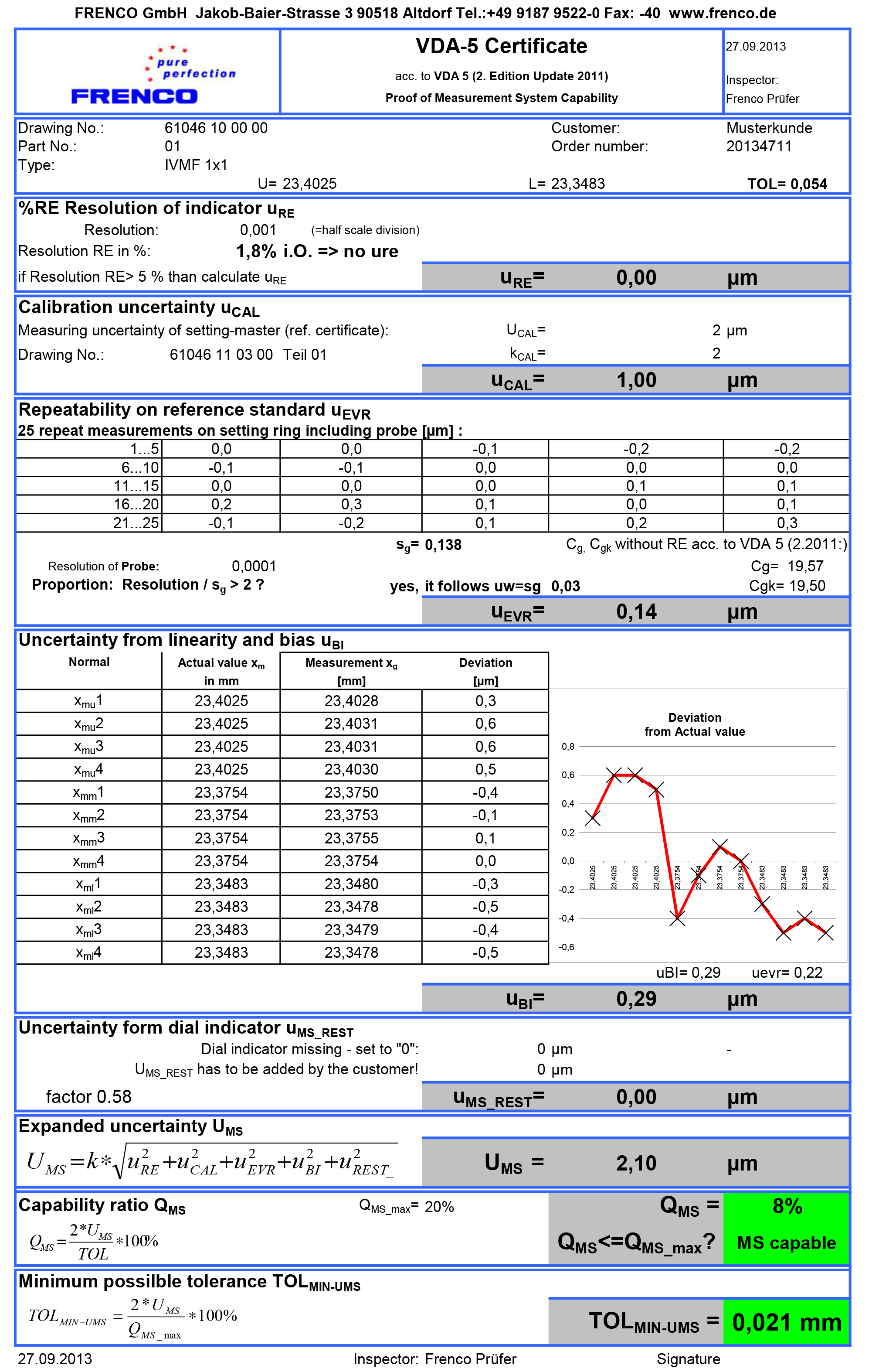 Upon request FRENCO issues a VDA 5 Certificate for Size Inspection Instruments. This certificate is designed according to VDA 5 and contains the measuring uncertainty of the measuring system.
